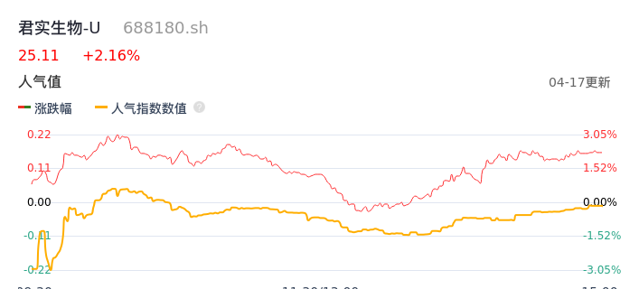 04月17日,君实生物-U收报25.11,股价涨幅2.16%,成交金额1.48亿元,换手率0.78%。