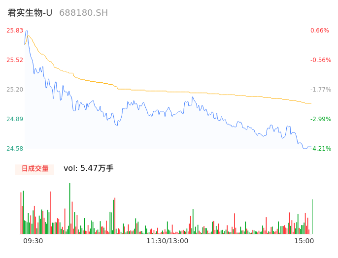04月16日,君实生物-U收报24.58,股价涨幅-4.21%,成交金额1.37亿元,换手率0.72%。