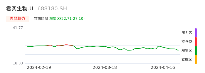 我们来看一下该股的九方特色指标强弱趋势的情况:君实生物-U自03月06日从持仓区下穿到观望区,股价近期持续走弱。短期已经进入空头行情,且下跌动能仍未衰竭。建议继续谨慎观望。
