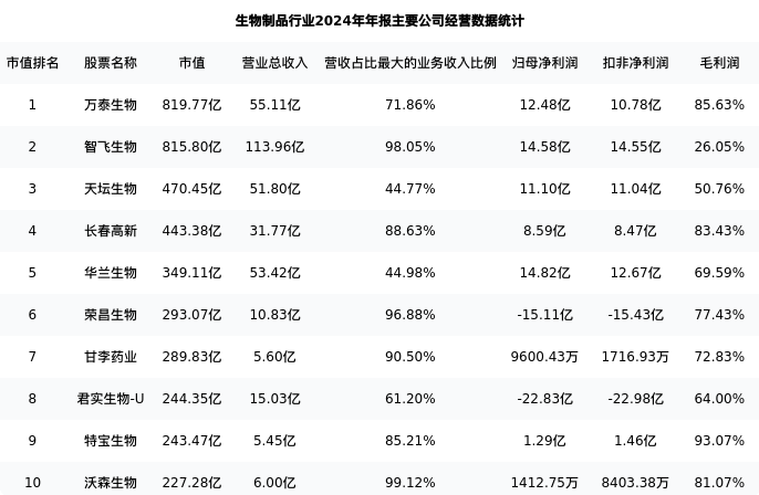 君实生物-U最新报告期数据为年报,下表汇总了生物制品行业内市值靠前的公司年报主要经营数据
