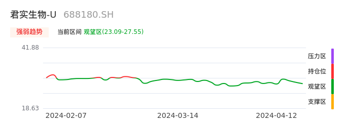 我们来看一下该股的九方特色指标强弱趋势的情况:君实生物-U自03月06日从持仓区下穿到观望区,股价近期持续走弱。短期已经进入空头行情,且下跌动能仍未衰竭。建议继续谨慎观望。