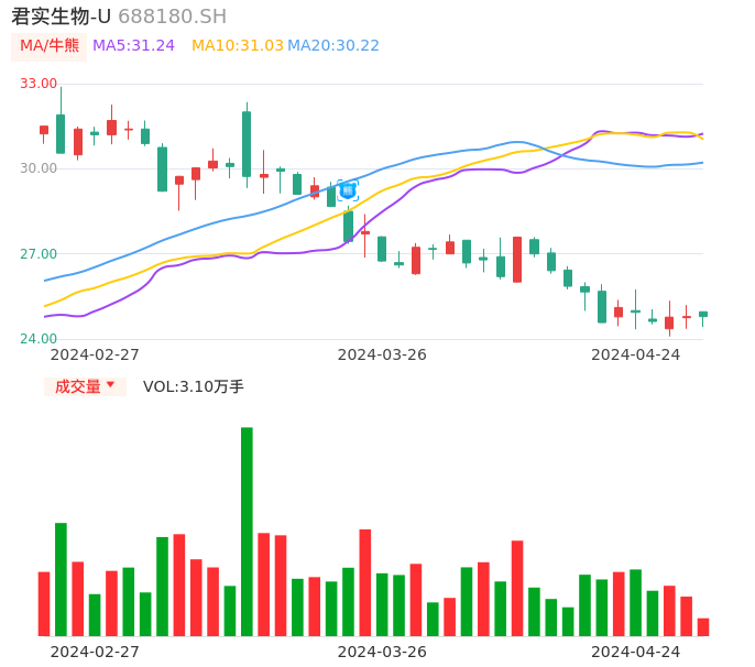 04月24日,君实生物-U收报24.79,股价涨幅0.00%,成交金额7657.53万元,换手率0.41%。