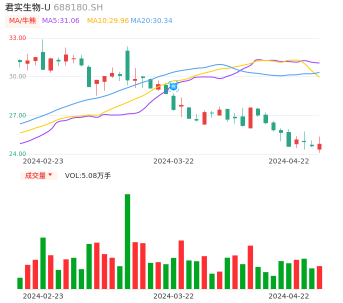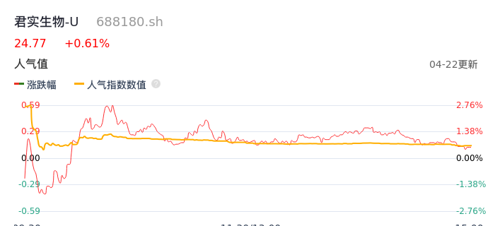 04月22日,君实生物-U收报24.77,股价涨幅0.61%,成交金额1.26亿元,换手率0.67%。