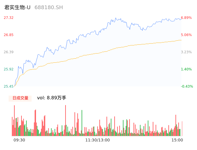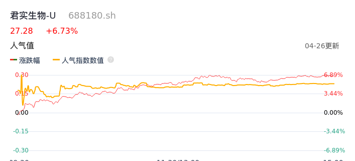 04月26日,君实生物-U收报27.28,股价涨幅6.73%,成交金额2.38亿元,换手率1.17%。