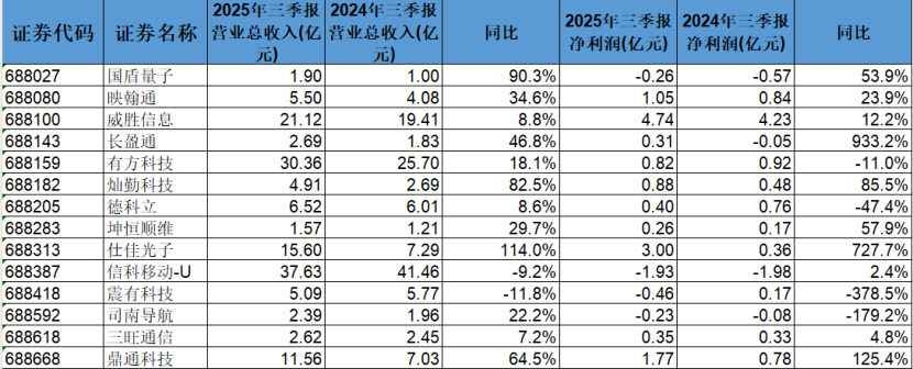 星矿数据显示,截至10月31日,科创板通信行业国盾量子、映翰通、长盈通、有方科技、灿勤科技等14家上市公司披露了2025年三季度业绩报告,合计实现净利润约10.68亿元,同比增长67.9%,整体呈现高增长态势。其中,12家公司前三季度实现同比正增长,占比超八成。