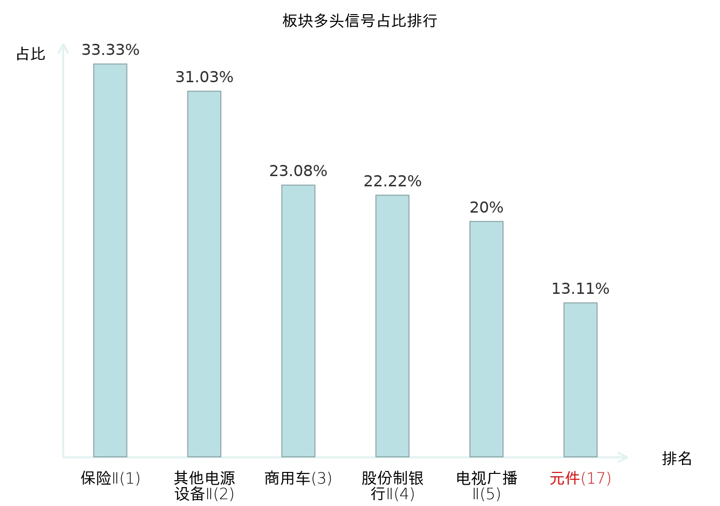 全市场所有行业板块中主力多头信号占比排名中,保险Ⅱ板块位居第一。股份制银行Ⅱ板块名次提升最快,较昨日上升119位。