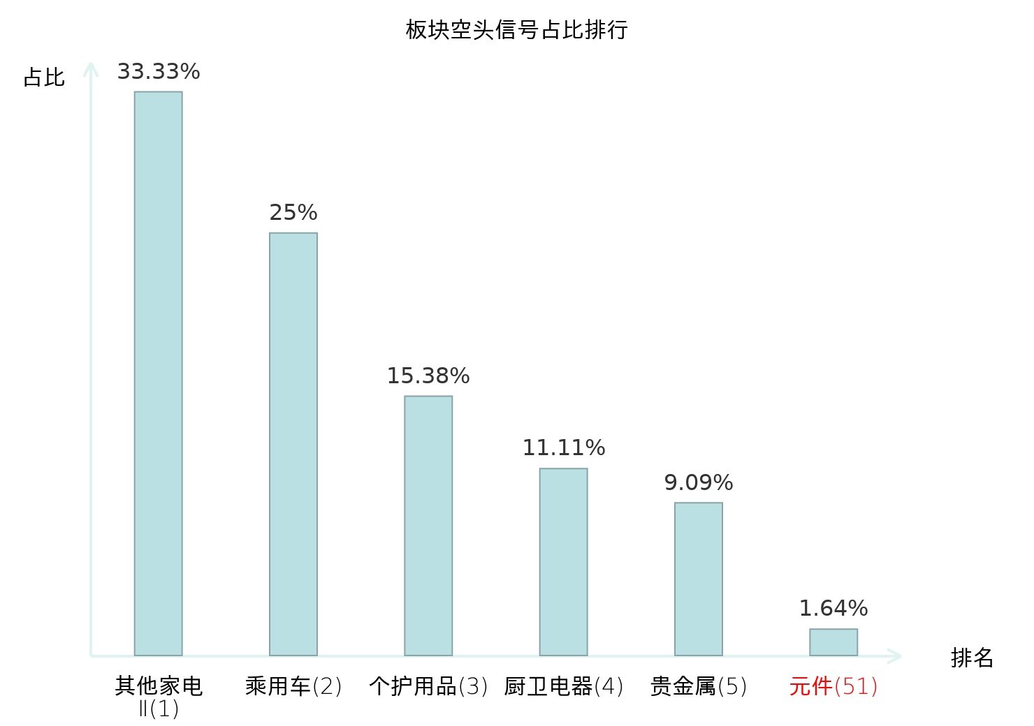 全市场所有行业板块中主力空头信号占比排名中,其他家电Ⅱ板块位居第一。个护用品板块名次提升最快,较昨日上升119位。
