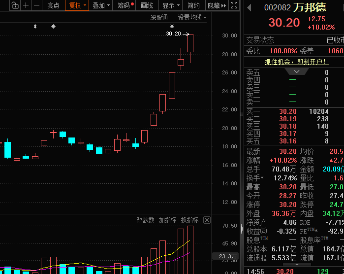 万邦德股价表现更为亮眼,公司预计一季度归母净利润为1.65亿元,同比增长985.40%。自预告发布以来,该股累计涨幅超过78%,最新股价创出历史新高。
