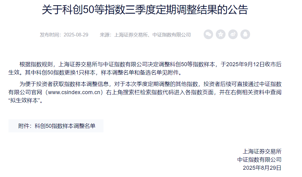 8月29日,上交所和中证指数公司联合发布公告,决定调整科创50等指数样本,于2025年9月12日收市后生效。