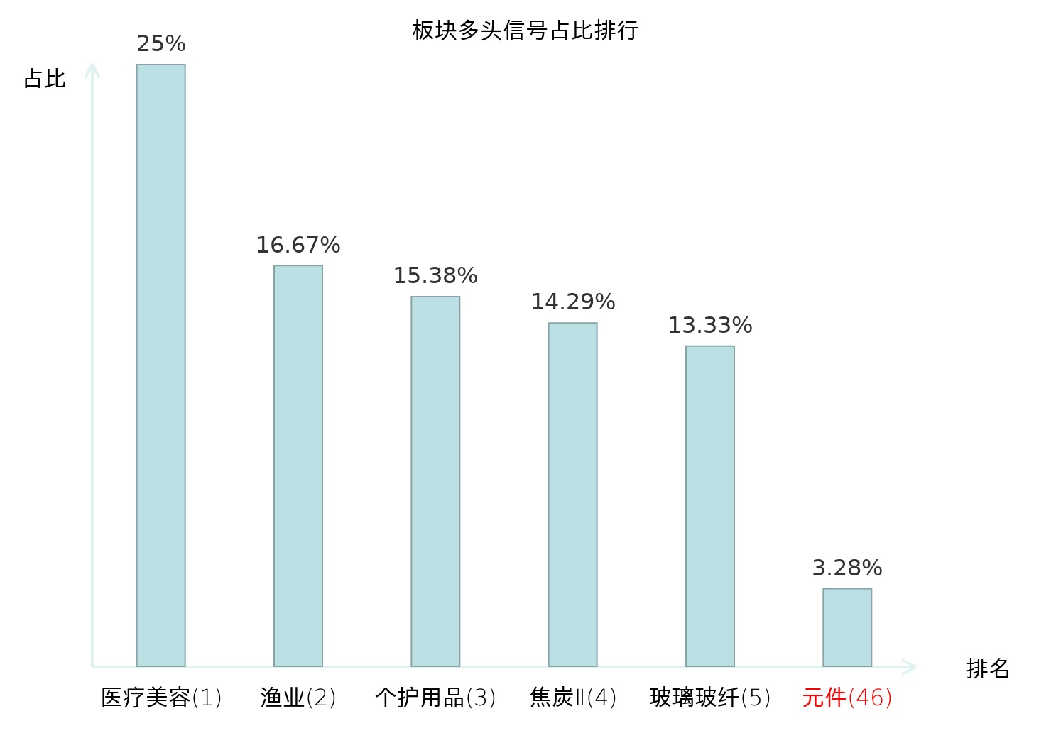 全市场所有行业板块中主力多头信号占比排名中,医疗美容板块位居第一。医疗美容板块名次提升最快,较昨日上升126位。