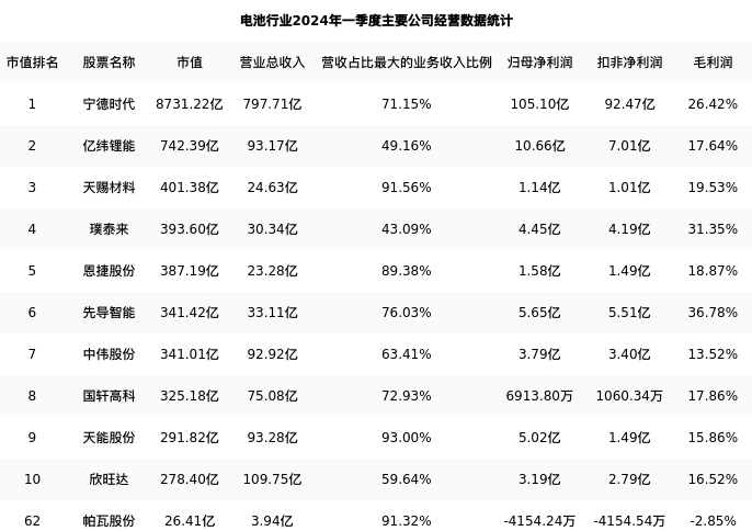 帕瓦股份最新报告期数据为一季度,下表汇总了电池行业内市值靠前的公司一季度主要经营数据