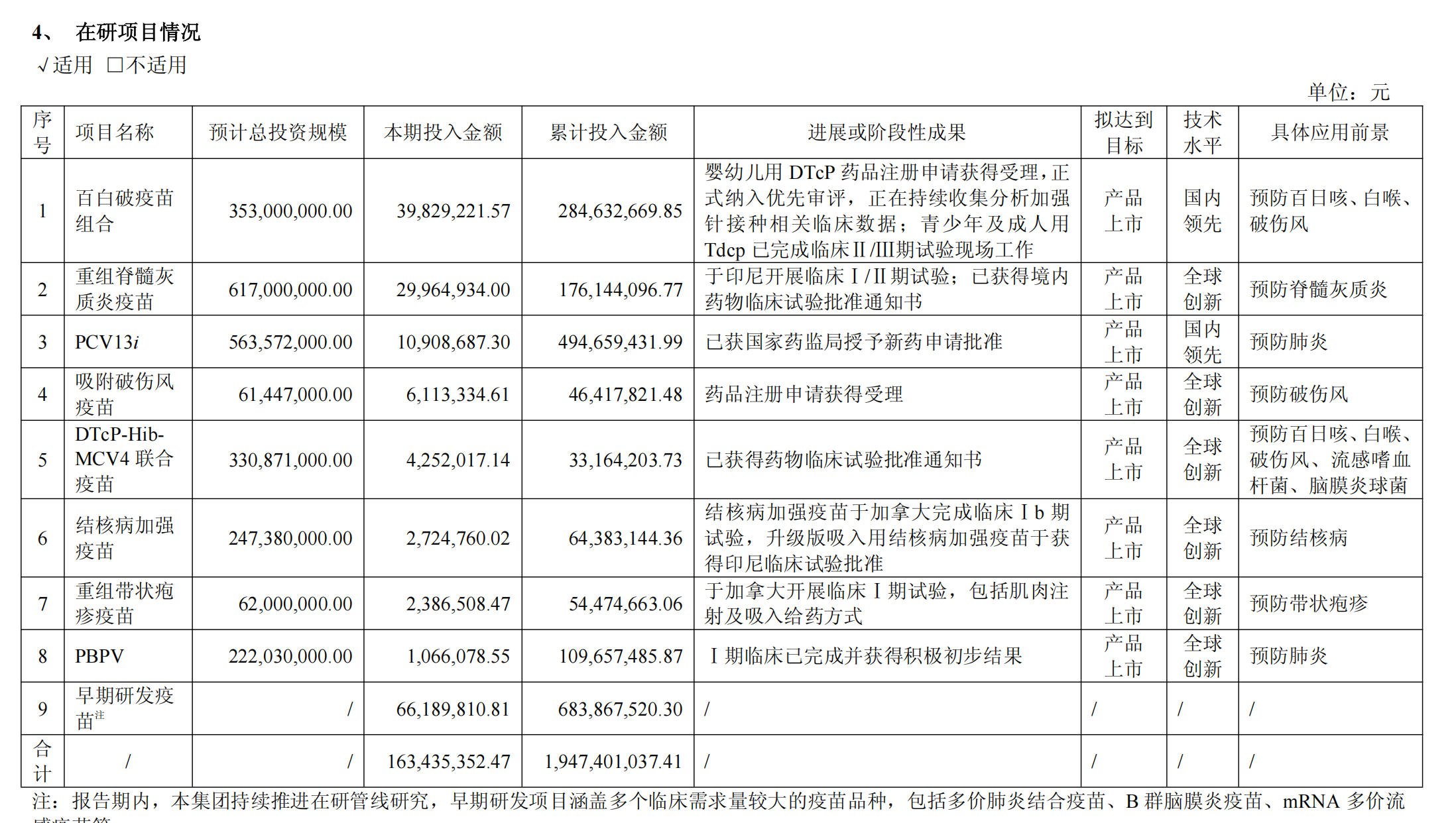 在研疫苗研发项目累计投入1.26亿元,进度84.00%,其部分子项目延期至2025年12月投入完毕。上述项目涉及重大调整。