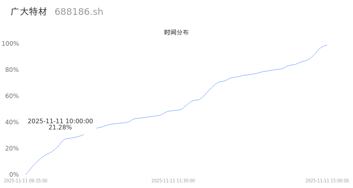 688186广大特材2025年11月11日成交5.64万手,成交金额1.38亿,相较昨日缩量4247手,换手率2.01%,成交清淡。