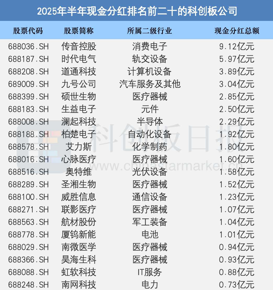 具体到公司排名,传音控股、时代电气、道通科技、九号公司、硕世生物为现金分红额度最多的五家公司,分别为9.12亿元、5.97亿元、3.89亿元、3.04亿元、2.85亿元。