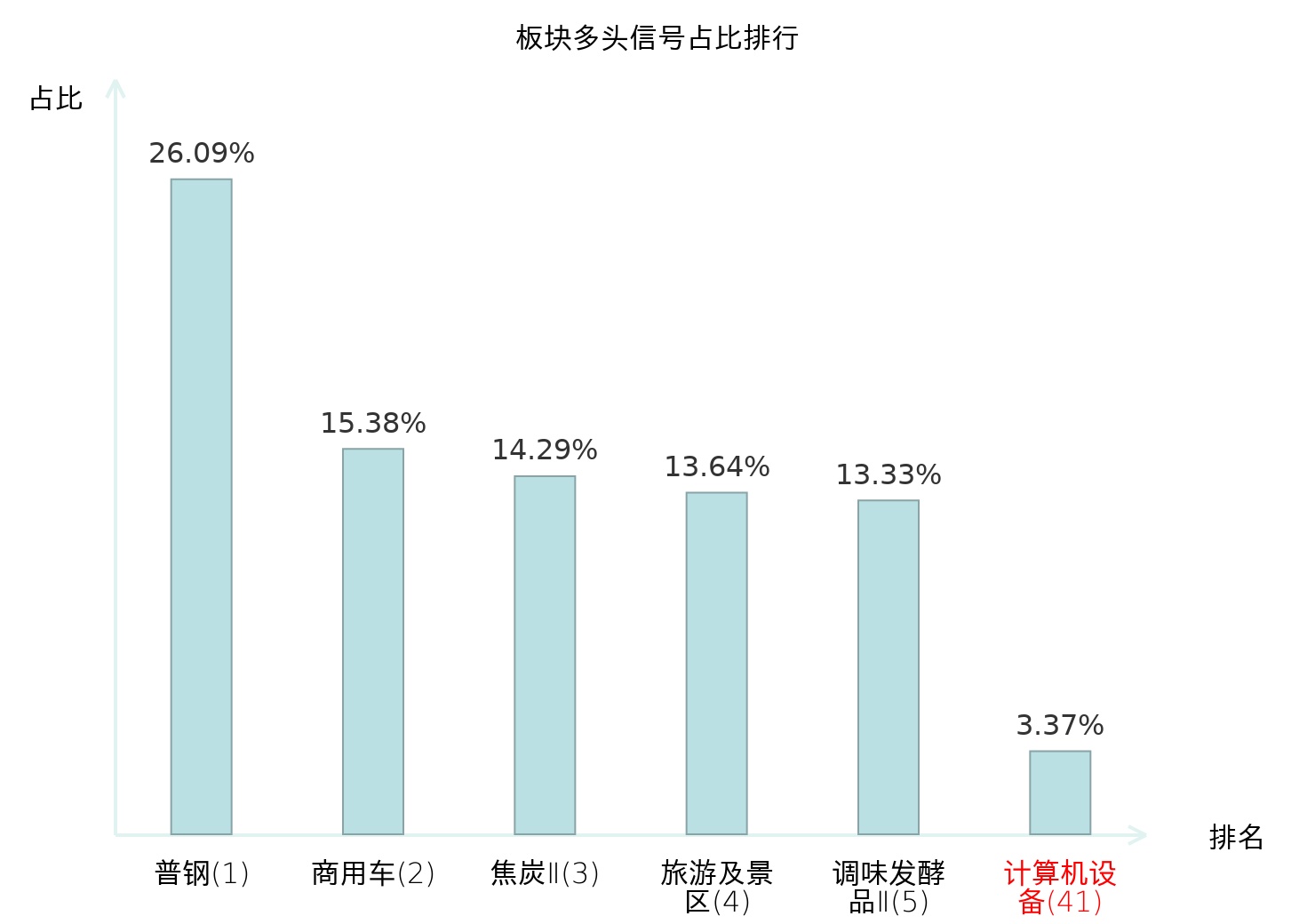 全市场所有行业板块中主力多头信号占比排名中,普钢板块位居第一。焦炭Ⅱ板块名次提升最快,较昨日上升119位。