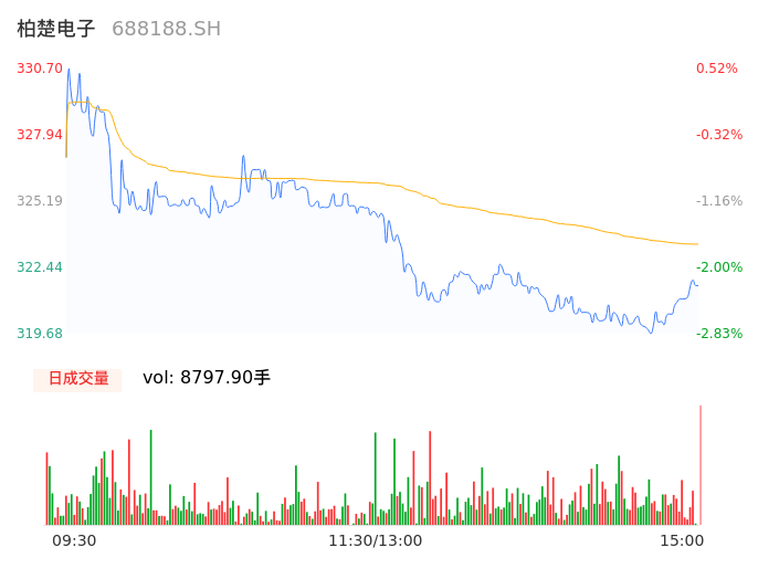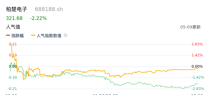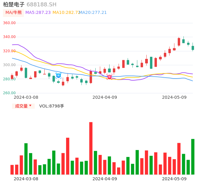 05月09日,柏楚电子收报321.68,股价涨幅-2.22%,成交金额2.84亿元,换手率0.60%。