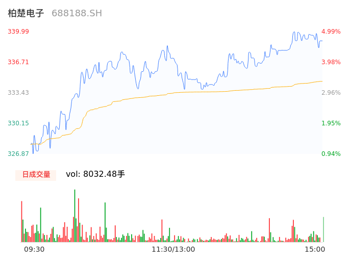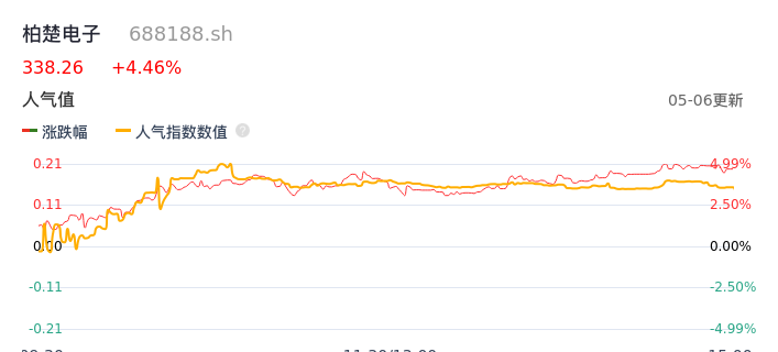 05月06日,柏楚电子收报338.26,股价涨幅4.46%,成交金额2.69亿元,换手率0.55%。