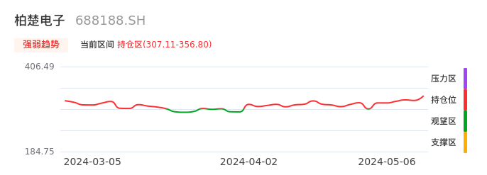 我们来看一下该股的九方特色指标强弱趋势的情况:柏楚电子自04月02日从观望区上穿到持仓区。股价近期在多头区域持续强势上扬,上升动能仍较为充足,可积极关注。后续重点关注上方压力位:356.80元是否能突破上攻。