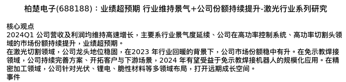 值得注意的是:2024年04月中信建投证券的吕娟/于芳博/杨超分析师,首次发布关于柏楚电子的研究报告,标题为:柏楚电子(688188):业绩超预期 行业维持景气+公司份额持续提升-激光行业系列研究。