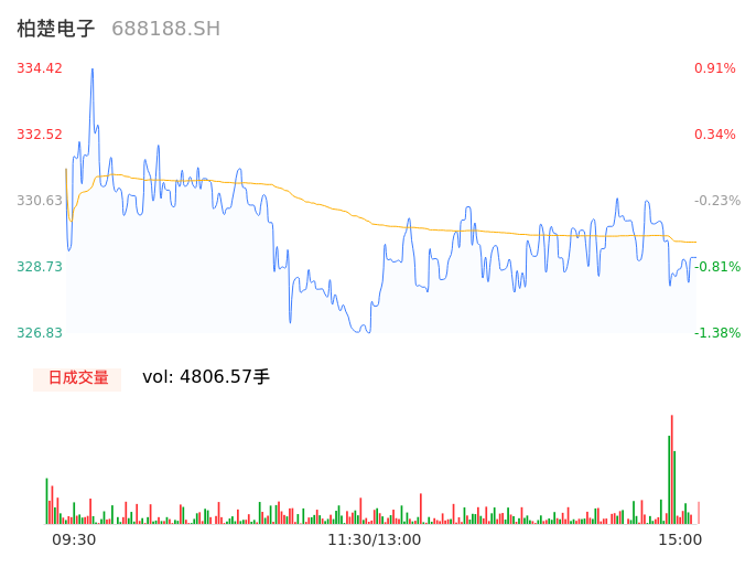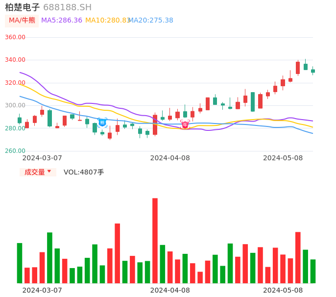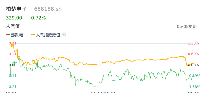 05月08日,柏楚电子收报329.00,股价涨幅-0.72%,成交金额1.58亿元,换手率0.33%。