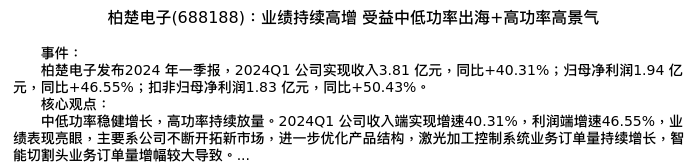 值得注意的是:2024年05月国投证券的郭倩倩分析师,首次发布关于柏楚电子的研究报告,标题为:柏楚电子(688188):业绩持续高增 受益中低功率出海+高功率高景气。