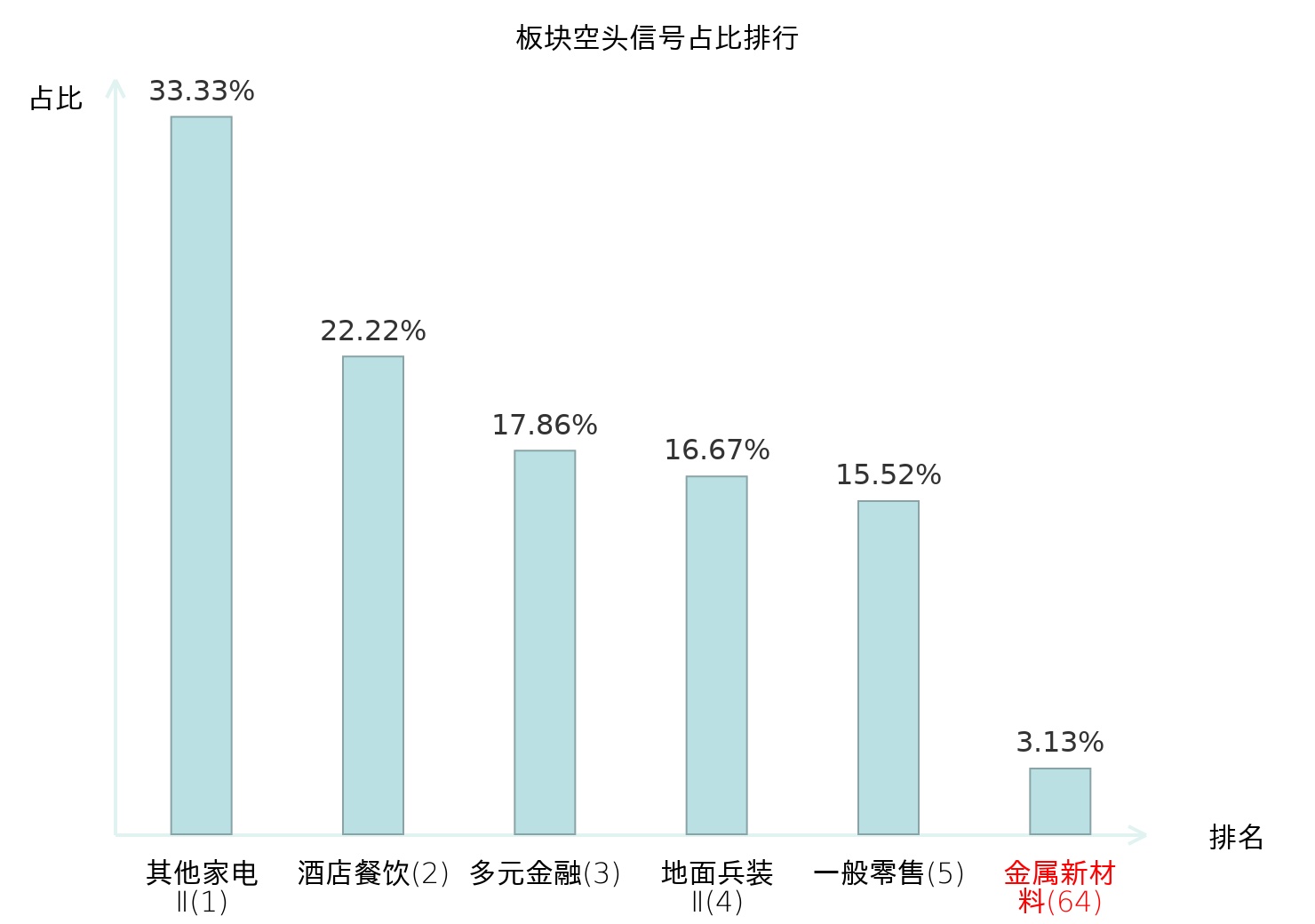 全市场所有行业板块中主力空头信号占比排名中,其他家电Ⅱ板块位居第一。广告营销板块名次提升最快,较昨日上升111位。