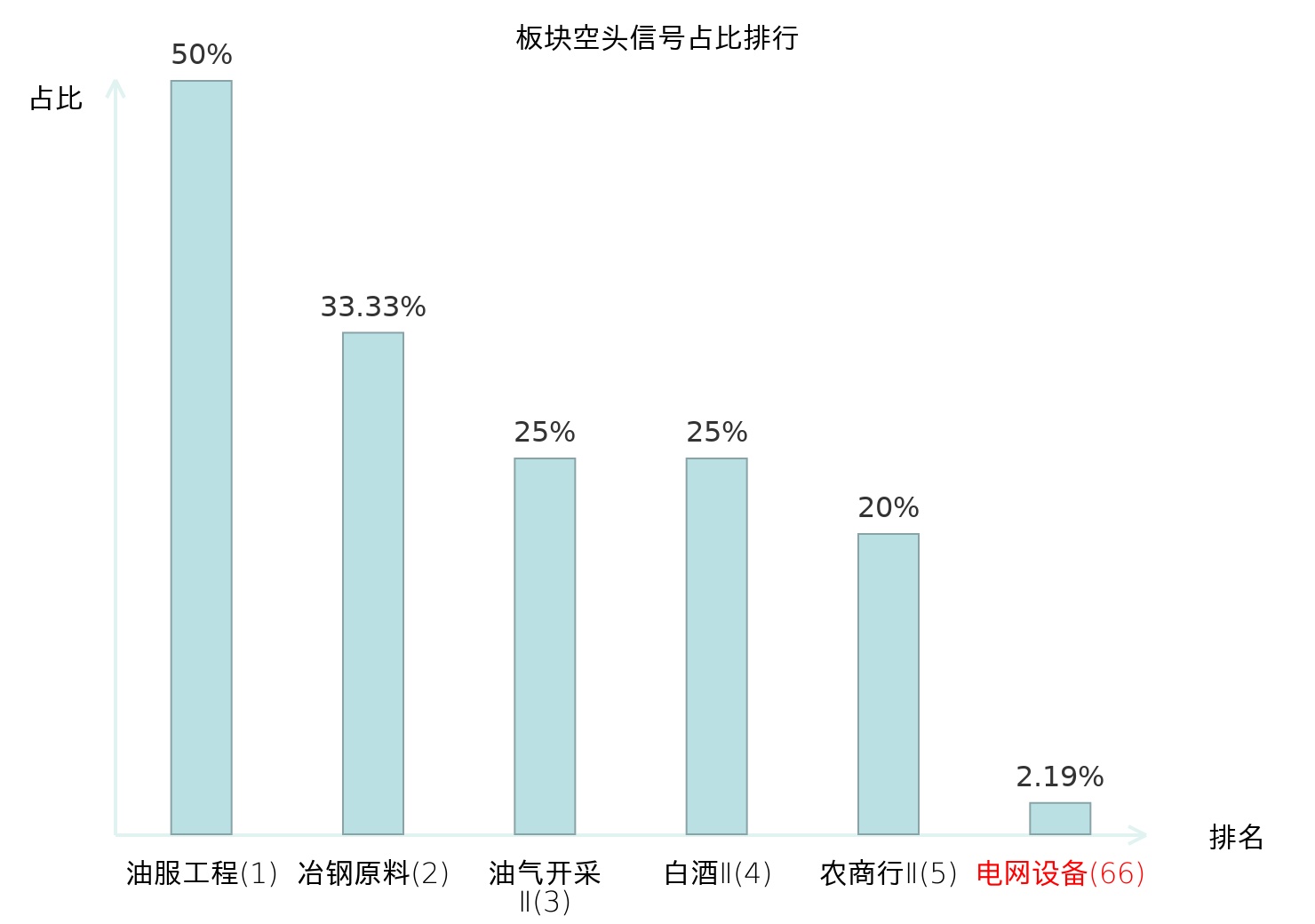 全市场所有行业板块中主力空头信号占比排名中,油服工程板块位居第一。白酒Ⅱ板块名次提升最快,较昨日上升110位。