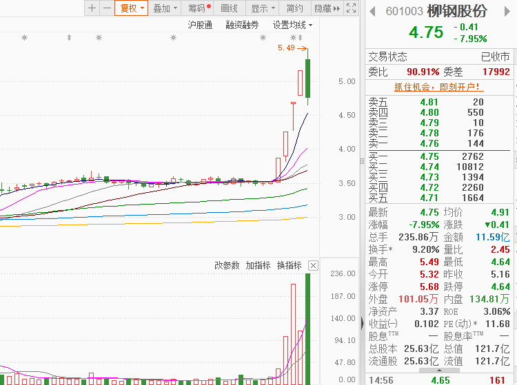 市场情绪:市场热点较为杂乱,个股涨多跌少,全市场超3200只个股上涨。今日共67股涨停,连板股总数12只,10股封板未遂,封板率为87%(不含ST股、退市股)。焦点股方面,柳钢股份一度跌停,塞力医疗断板,市场连板高度降至3连板。电力股华银电力5天4板,核电板块长城电工6天4板,稳定币概念股金一文化7天4板。