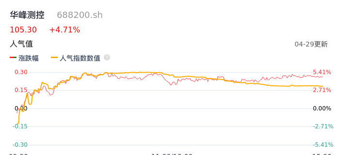 04月29日,华峰测控收报105.30,股价涨幅4.71%,成交金额1.07亿元,换手率0.76%。
