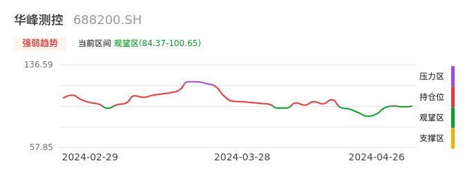 我们来看一下该股的九方特色指标强弱趋势的情况:华峰测控自04月16日从持仓区下穿到观望区。股价近期持续下跌后,短期出现止跌迹象。后续重点关注能否再次站上多空分界点:100.65元。如未能有效突破则可能进入新一轮空头行情。