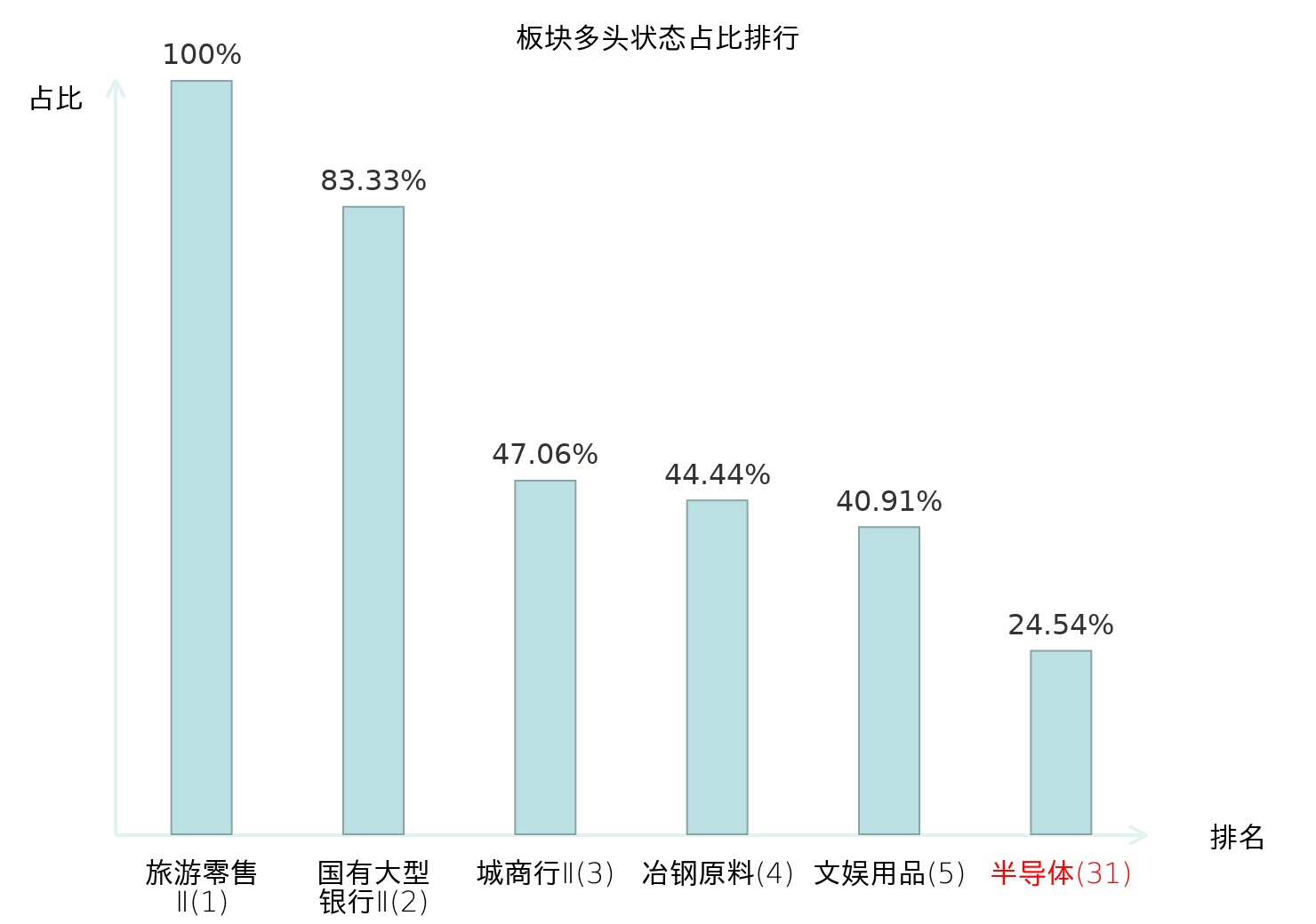 全市场所有行业板块中主力多头状态占比排名中,旅游零售Ⅱ板块位居第一。旅游零售Ⅱ板块名次提升最快,较昨日上升130位。