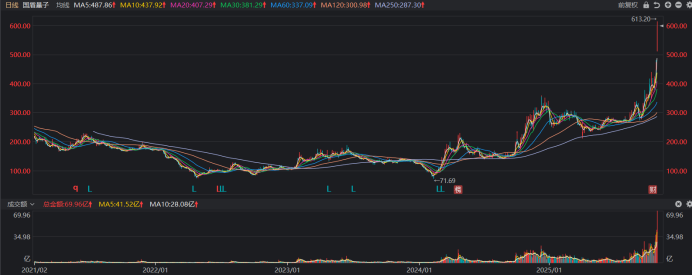 近期,国盾量子股价快速拉升,截至今日收盘,其近28个交易日累计上涨106.4%,成为年内又一只“翻倍牛”。其中,国盾量子近2个交易日连续涨幅超10%,成交额也接连放量,今日成交额达69.96亿元,为其上市以来的最高纪录。目前,国盾量子以599元的股价在整个A股市场中位列第三,仅次于贵州茅台(1426.74元)、寒武纪(1422元)。