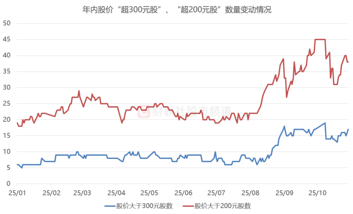 注:年内股价“超300元股”、“超200元股”数量变动情况(截至10月30日收盘)