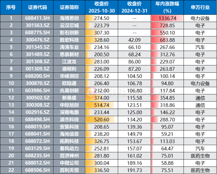 若以今日股价较去年年末时相比,除云汉芯城、海博思创、影石创新3只年内上市的新股外,累计共有20股为新晋的“超200元股”,其中,胜宏科技、思泉新材、德明利、涛涛车业、江波龙、深南电路7股去年年末时股价不足百元。分行业板块来看,年内新增的这些高价股中,电子股数量占比较高,此外还涵盖通信、汽车、电力设备、医药生物等板块。