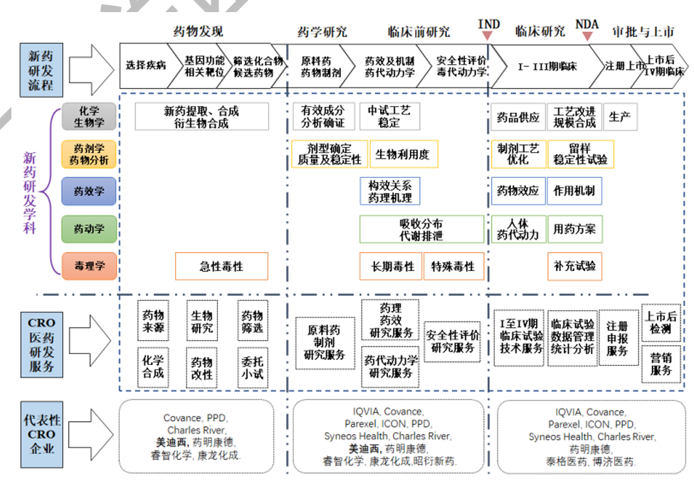 临床前CRO:从事化合物研究服务和临床前研究服务,主要包括新药发现、先导化合物和活性药物中间体的合成及工业研发、安全性评价研究服务、药代动力学、药理毒理学、动物模型的构建等。目前国内从事临床前CRO的主要公司有药明康德、康龙化成、昭衍新药、睿智化学、美迪西等。