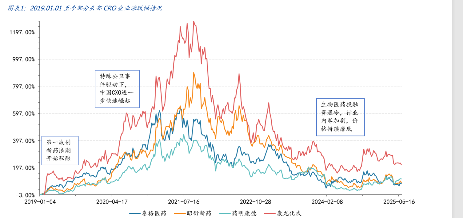 回顾国内CRO行业发展历程,上一波产业景气周期主要由创新药大的产业浪潮驱动。在政策支持、资本热捧以及市场需求增长的多重利好因素影响下,创新药研发成为生物医药行业的热门赛道。为了提高研发效率、降低研发成本,众多药企纷纷将部分研发环节外包给CRO企业,这使得CRO行业迎来了快速发展的黄金时期。一时间,CRO企业数量不断增加,业务规模持续扩大,行业整体呈现出繁荣景象。随着行业的快速扩张,供需两端的问题逐渐暴露出来。 在供给端,大量资本涌入CRO行业,导致产能快速扩张。CRO企业为了抢占市场份额,努力加大投入、扩充团队、新建实验室,使得行业产能出现过剩现象。同时,由于行业内企业技术水平参差不齐,服务同质化严重,市场竞争日益激烈,企业之间陷入了价格战的恶性循环,行业内卷程度不断加剧。 在需求端,资本市场融资通路不畅和医药政策成为制约行业发展的关键因素。创新药研发具有投入大、周期长、风险高的特点,药企需要持续的资金支持才能维持研发项目的推进。然而,随着资本市场环境的变化,全球进入加息周期,全球经济下行,地缘政治冲突加剧。医药基金资产退出、上市通路愈发困难,投资机构对创新药项目的投资变得更加谨慎,融资难度加大。许多创新药企因资金短缺,不得不削减研发预算,减少对CRO企业的订单需求或降低报价金额,直接导致CRO行业需求端出现萎缩,行业发展进入一段下行期。 复盘CRO行业股价,我们可以发现CRO行业下跌了进4年年多,从2021-2025年,我们可以发现CRO行业龙头,比如药明康德,康龙化成,泰格医药等过去三年多,业绩都是处于同比下滑阶段,进入2025年,我们通过Q1季度业绩可以发现,整体行业业绩有触底回升的趋势,有的甚至出现正增长。 图:CRO行业股价复盘 |