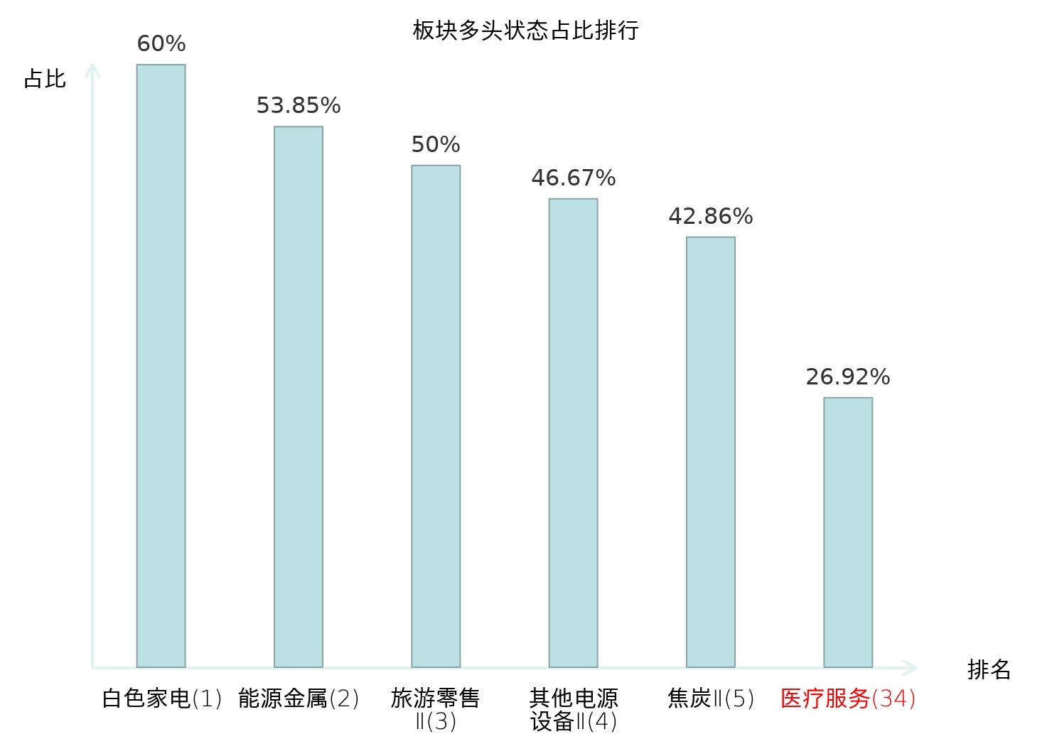 全市场所有行业板块中主力多头状态占比排名中,白色家电板块位居第一。油服工程板块名次提升最快,较昨日上升87位。
