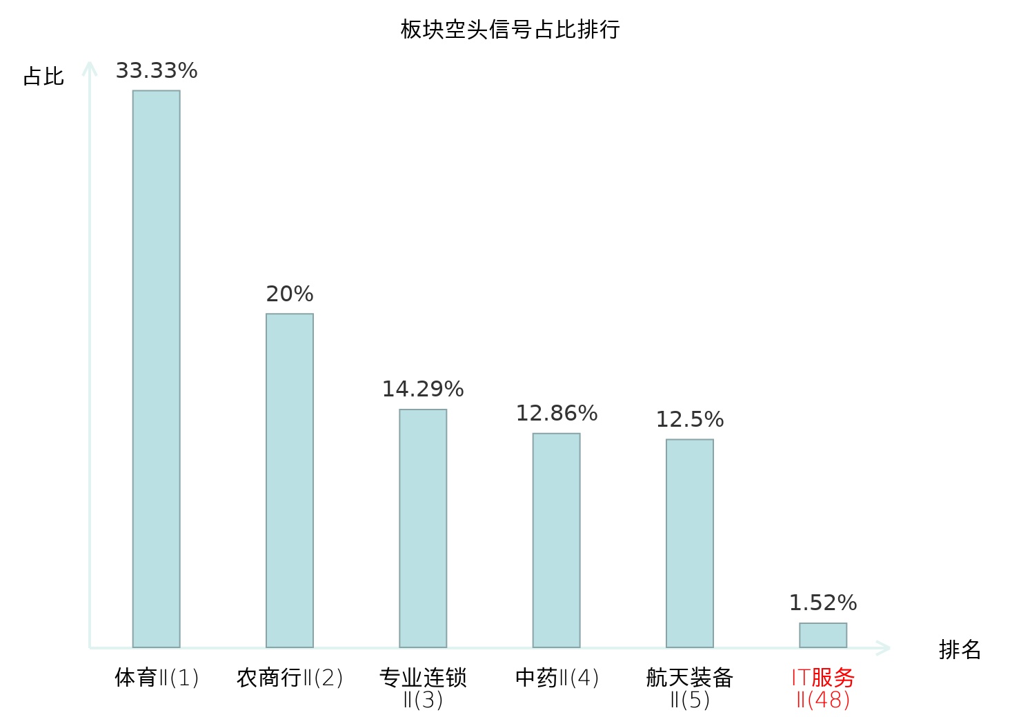 全市场所有行业板块中主力空头信号占比排名中,体育Ⅱ板块位居第一。医药商业板块名次提升最快,较昨日上升107位。