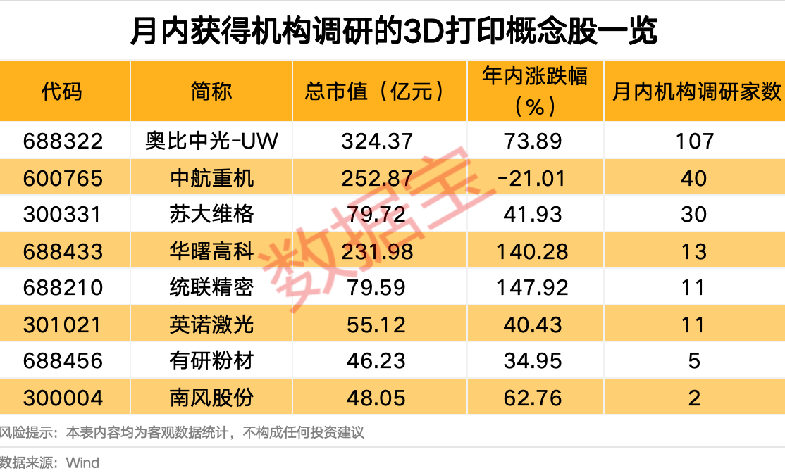 从机构关注度来看,11月以来,8只3D打印概念股获得机构调研。