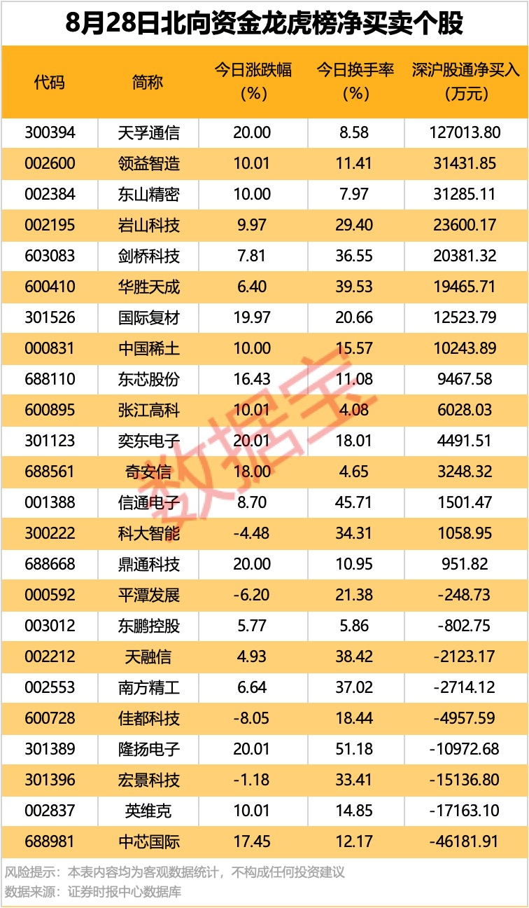 今日龙虎榜现身个股中,15股获北向资金净买入,其中8股净买入金额均超1亿元。净买入居首的是天孚通信,金额为12.7亿元;领益智造东山精密岩山科技分别获净买入3.14亿元、3.13亿元、2.36亿元。