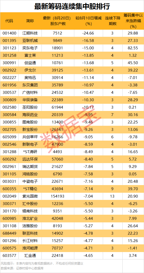 据数据宝统计,超600股公布了截至8月20日最新股东户数,相比之前各期,有97股股东户数连续减少3期以上,其中股东户数最多已连降13期,也就是说筹码呈持续集中趋势。