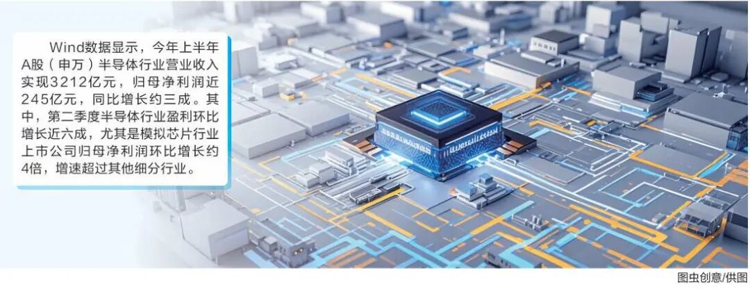 Wind数据显示,今年上半年A股(申万)半导体行业营业收入实现3212亿元,归母净利润近245亿元,同比增长约三成。其中,第二季度半导体行业盈利环比增长近六成,尤其是模拟芯片行业上市公司归母净利润环比增长约4倍,增速超过其他细分行业;34家模拟芯片上市公司中,约六成上市公司第二季度盈利同比上涨,不少个股“绝地反击”,同比大幅扭亏。