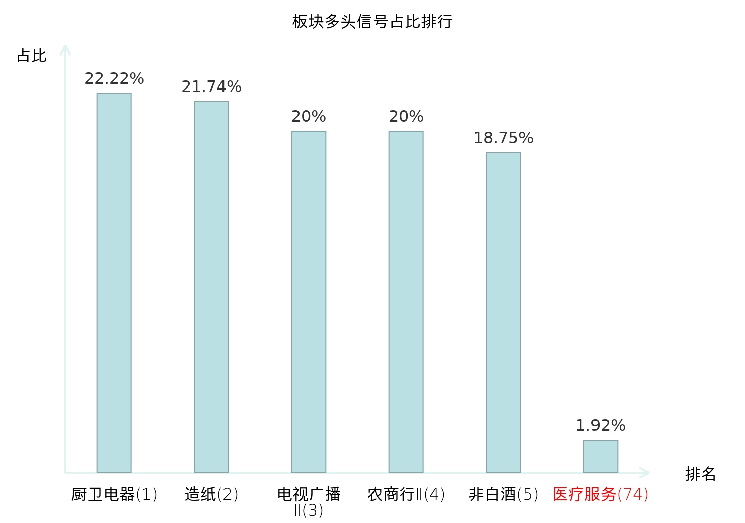 全市场所有行业板块中主力多头信号占比排名中,厨卫电器板块位居第一。厨卫电器板块名次提升最快,较昨日上升115位。