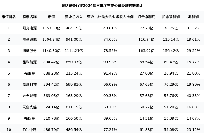 晶科能源最新报告期数据为三季度,下表汇总了光伏设备行业内市值靠前的公司三季度主要经营数据