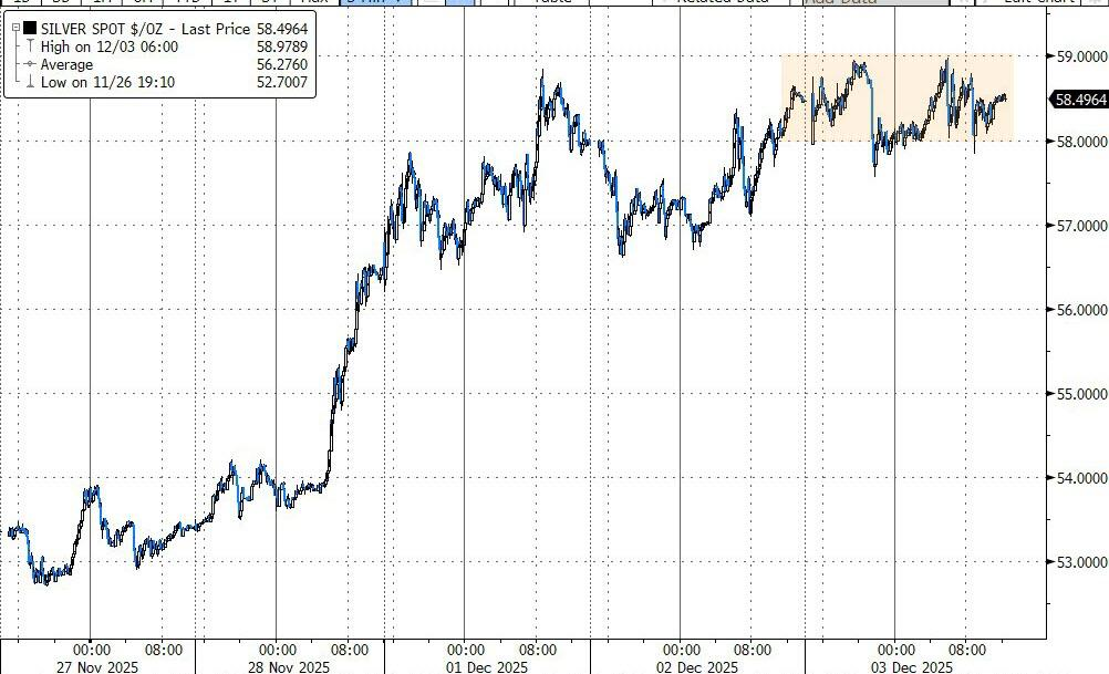 纽约尾盘,现货白银大致持平,报58.4880美元/盎司,日内交投于58.9789-57.5578美元区间。