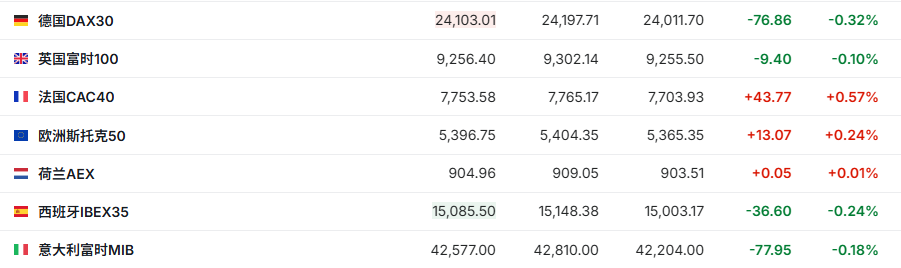 正在交易的欧洲股市涨跌不一,德国DAX指数现跌0.32%,英国富时100指数跌0.1%,法国CAC40指数涨0.57%。