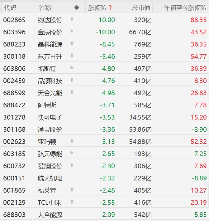 A股市场太空光伏概念股集体回调,其中,钧达股份、金辰股份跌停,晶科能源跌超8%,东方日升跌超5%,福斯特、晶澳科技、天合光能跌超4%。消息面上,近日,受马斯克团队相关调研消息带动,太空光伏概念持续引爆市场。但中国光伏行业协会执行秘书长刘译阳昨日表示,目前,太空光伏技术仍处于探索和验证的初期阶段,确定明确的技术方向为时尚早。
