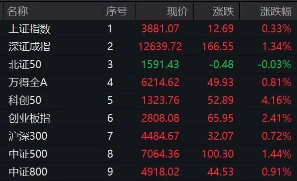 今日早盘,A股震荡上扬,科创50指数放量大涨逾4%,再创3年半来新高,深证成指创业板指等亦创多年来新高。下跌个股多于上涨个股,量能保持平稳,1小时成交超万亿元。