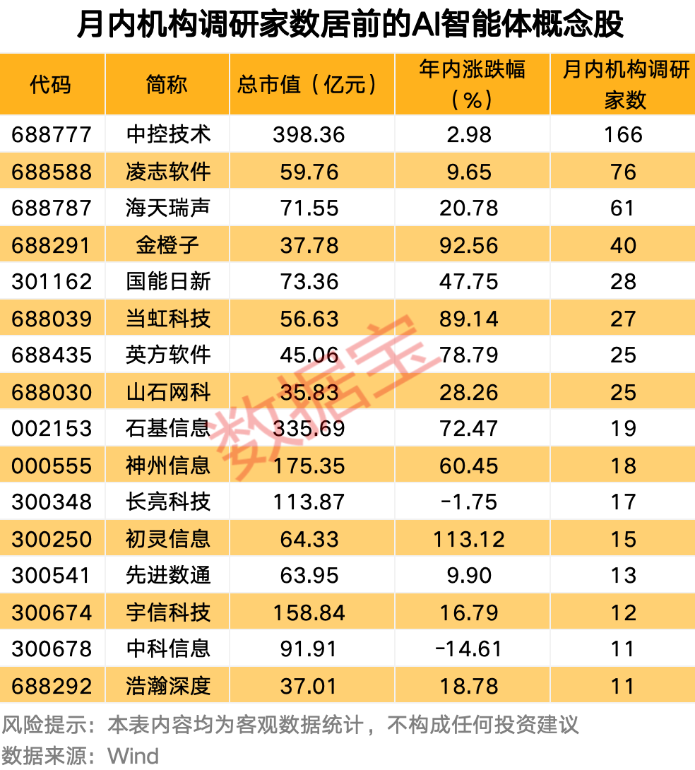 据证券时报·数据宝统计,AI智能体概念股有200余只,今年以来,17股的股价上涨幅度均超100%,品茗科技开普云宏景科技的股价涨幅居前,年内分别上涨648.82%、264.2%和228.59%。