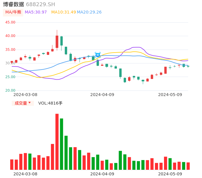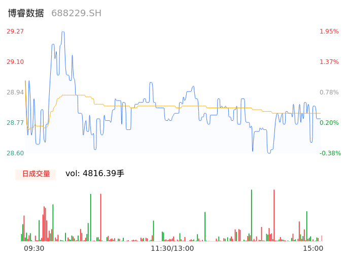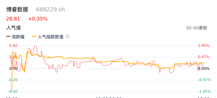 05月09日,博睿数据收报28.81,股价涨幅0.35%,成交金额1388.15万元,换手率1.08%。